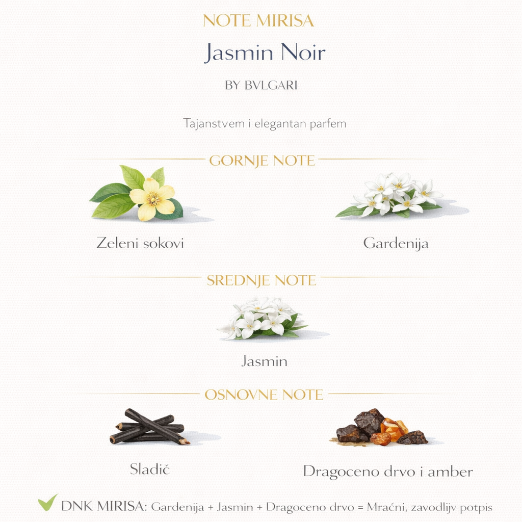 Jasmin Noir je misteriozan, elegantan i izrazito senzualan miris koji odiše tamnom, sofisticiranom ženstvenošću. Otvara se diskretno i profinjeno, a zatim se polako razvija u bogat, kremast i zavodljiv cvetni akord sa toplom, luksuznom pozadinom. Na koži ostavlja utisak dubine i rafiniranosti, bez ikakve grubosti ili napadnosti.
