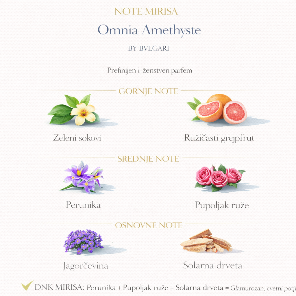 Ovo je parfem za ženu koja voli suptilan stil, eleganciju i nenametljivu privlačnost. Savršen je za svakodnevno nošenje, posao, prolećne i letnje dane, kada želiš da mirišeš čisto, nežno i sofisticirano. Omnia Amethyste je tih, ali prepoznatljiv miris — poput finog nakita koji se ne nameće, ali se uvek primećuje. 💜✨